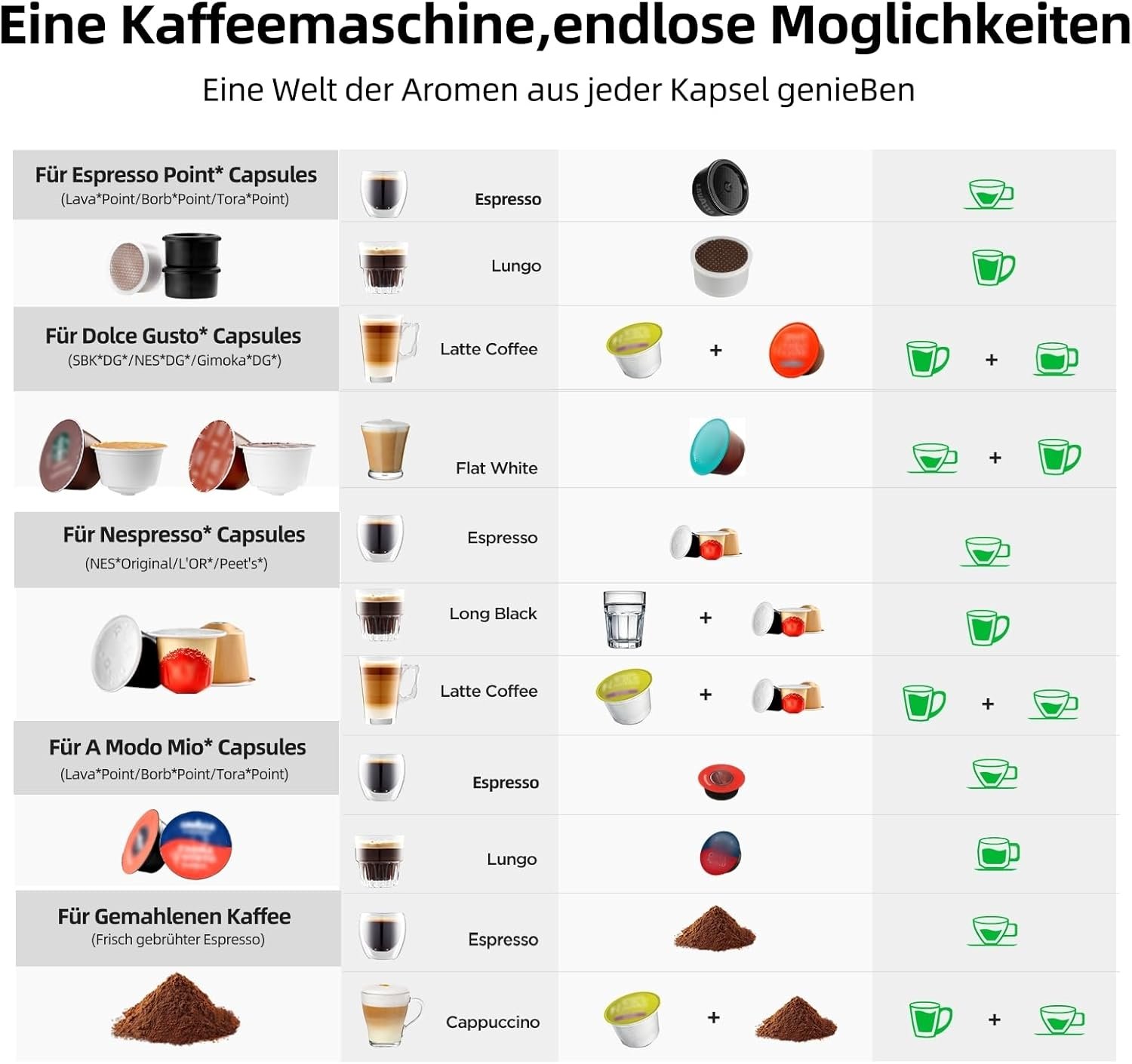 - 【VIELSEITIGE 5-IN-1 KOMPATIBILITÄT & KOMPAKTES DESIGN】: Diese platzsparende Maschine (28,5T × 13,7B × 27,5H cm) ist kompatibel mit Nespresso Original, Dolce Gusto, Lavazza A Modo Mio, FAP Espresso Point Kapseln sowie gemahlenem Kaffee. Sie ermöglicht die Zubereitung verschiedener Getränke, von Espresso bis hin zu heißer Schokolade, mit nur einem kompakten Gerät – ideal für Zuhause oder das Büro