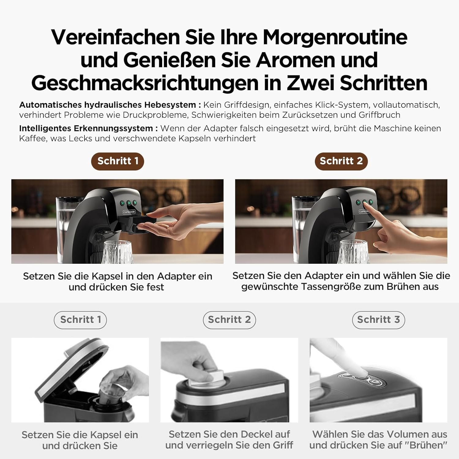 - 【HYDRAULISCHES BRÜHSYSTEM FÜR LEICHTE BEDIENUNG】: Das fortschrittliche hydraulische System ermöglicht ein sanftes Einlegen und Entfernen der Kapseln ohne schwergängige Hebel. Der abnehmbare 0,8-Liter-Wassertank und die speziellen Adapter verhindern eine Geschmacksübertragung zwischen verschiedenen Kaffeesorten und gewährleisten einen reinen Geschmack bei jeder Tasse
