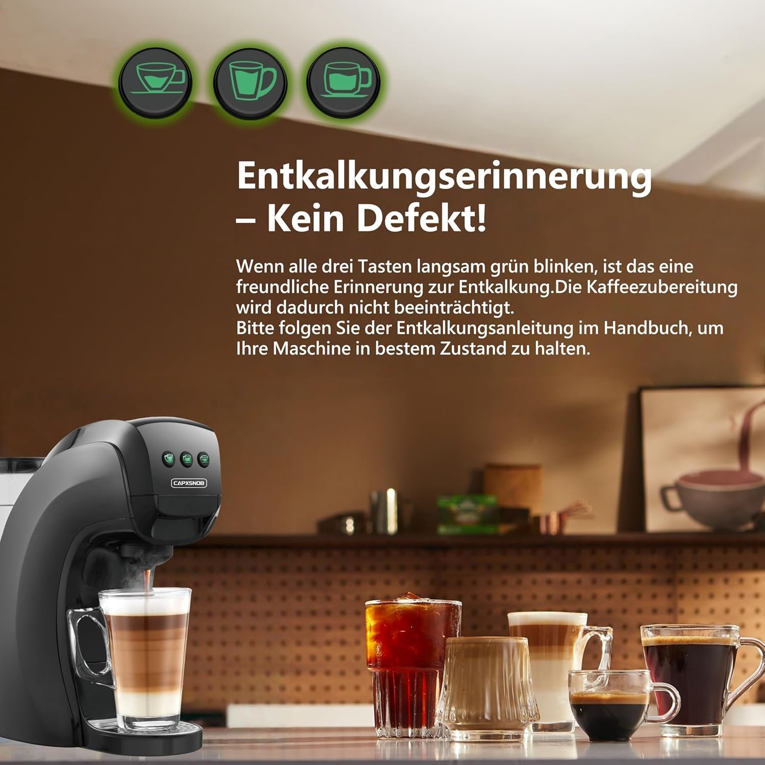 - 【ENTKALKUNGSWARNSYSTEM】: Die Warriors1 SV835L 5 in 1 Kaffee Maschine verfügt über ein benutzerfreundliches Warnsystem mit drei grünen Lichtern, die nach 200 Extraktionen gleichzeitig blinken und auf die Notwendigkeit einer Entkalkung hinweisen. Um die Warnung zu löschen, aktivieren Sie einfach das Entkalkungsprogramm, um eine optimale Leistung sicherzustellen und die Lebensdauer der Maschine für konstant großartigen Kaffeegeschmack zu verlängern